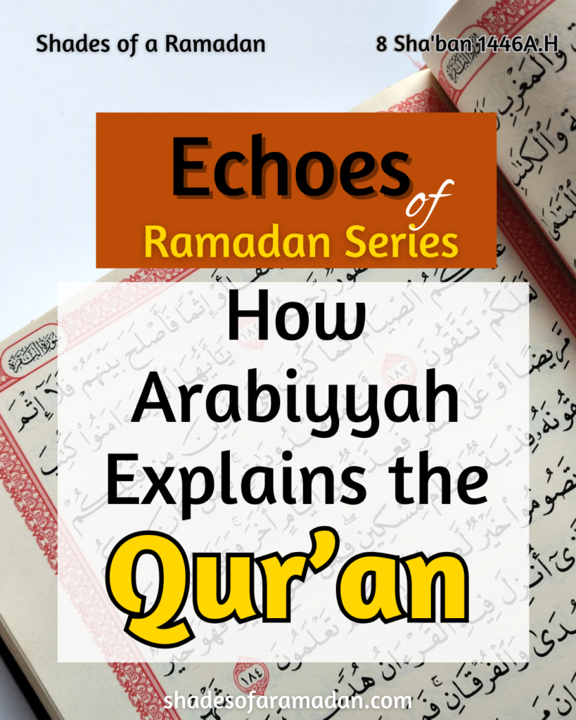 And then she tries to explain her experiences with Arabic grammar, and to be fair, reading her experiences made me think of my experiences. I have been in and out of class, disappearing three times, I think, and keep going back looking for easier ways. I think the most important thing is remembering – because sometimes we get so caught up with learning the language and writing exams and trying to memorise poetry- we forget why we started in the first place. Why do we go to school? So, we can emerge and do something with it. It’s more the goal that drives our doing, right? So why are we here? Because we want to be able to connect with Allah’s words. She says that’s what has kept her going, knowing that there are secrets in this book that she can unlock. That I can unlock. That you can unlock.